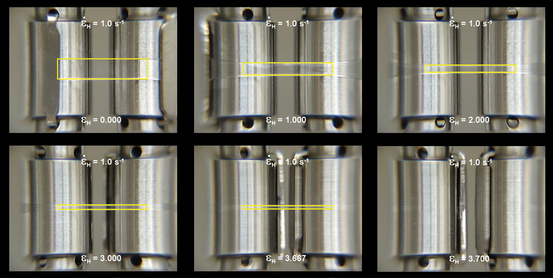being streched at room temperature at a Hencky strain rate of 1 s-1. Witness the necking
